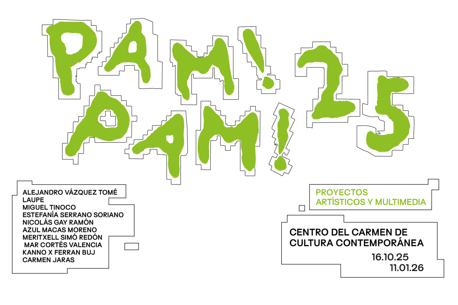 Comisariado: Laura Silvestre y José Luis Clemente La exposición PAM!PAM! regresa al Centre del Carme, el lugar donde arrancó este proyecto en 2014 y donde se mantuvo hasta 2016. Este regreso es especialmente simbólico porque nos devuelve al lugar donde se fraguó esta iniciativa, como un retorno también al lugar que fuera Escuela de Bellas Artes. La exposición PAM!PAM!25 Proyectos Artísticos y Multimedia se incuba en el programa PAM! con el objetivo de visibilizar y poner a disposición de la sociedad valenciana el trabajo inicial de los jóvenes artistas, tras su paso por la Facultad de Bellas Artes. En esta muestra, los 10 artistas seleccionadosLEER MÁS