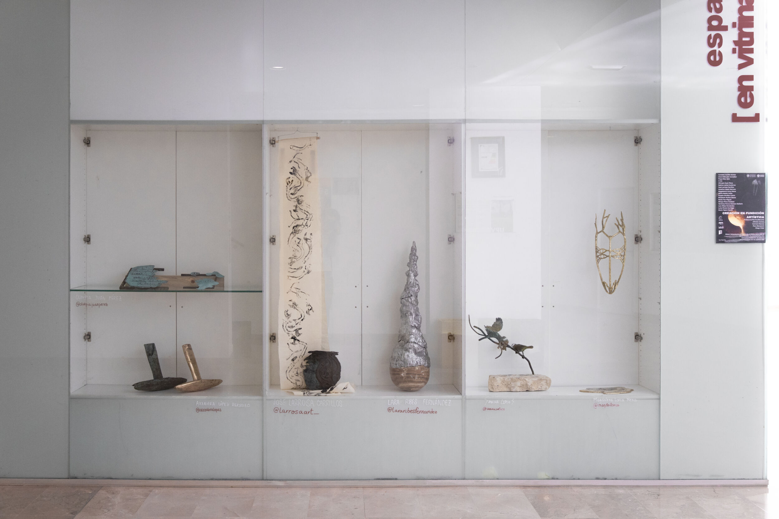 Així, l’exposició arreplega treballs fosos en alumini, llautó o bronze, escultures i joieria, desenrotllades durant el primer quadrimestre del curs, en el qual s’emmarca l’assignatura de fosa, dels estudiants que voluntàriament han decidit participar en esta. Totes les propostes mostren una gran qualitat tècnica i sorgixen, com hem assenyalat, dels interessos artístics de cada participant. Servix la mostra com a aparador per a futures promocions d’estudiants que es troben estudiant Grau, i que es motiven amb la possibilitat d’expressar-se en metall fos durant els estudis en el Màster Universitari de Producció Artística.