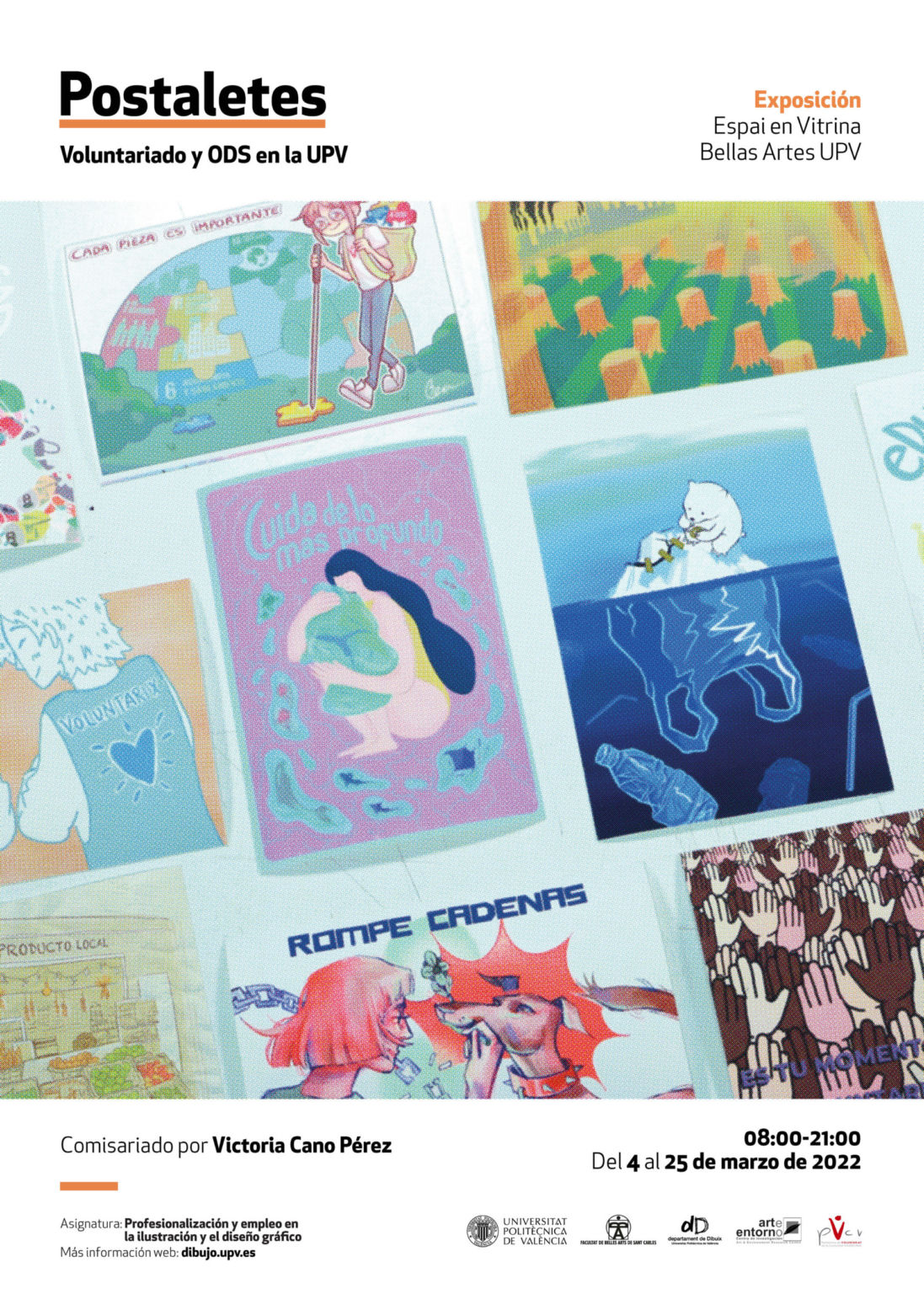 POSTALETES, VOLUNTARIAT I ODS a la UPV és una exposició en què participa l’alumnat de l'assignatura Professionalització i Ocupació en la Il·lustració i el Disseny Gràfic dels cursos acadèmics 2020/21 i 2021/22.