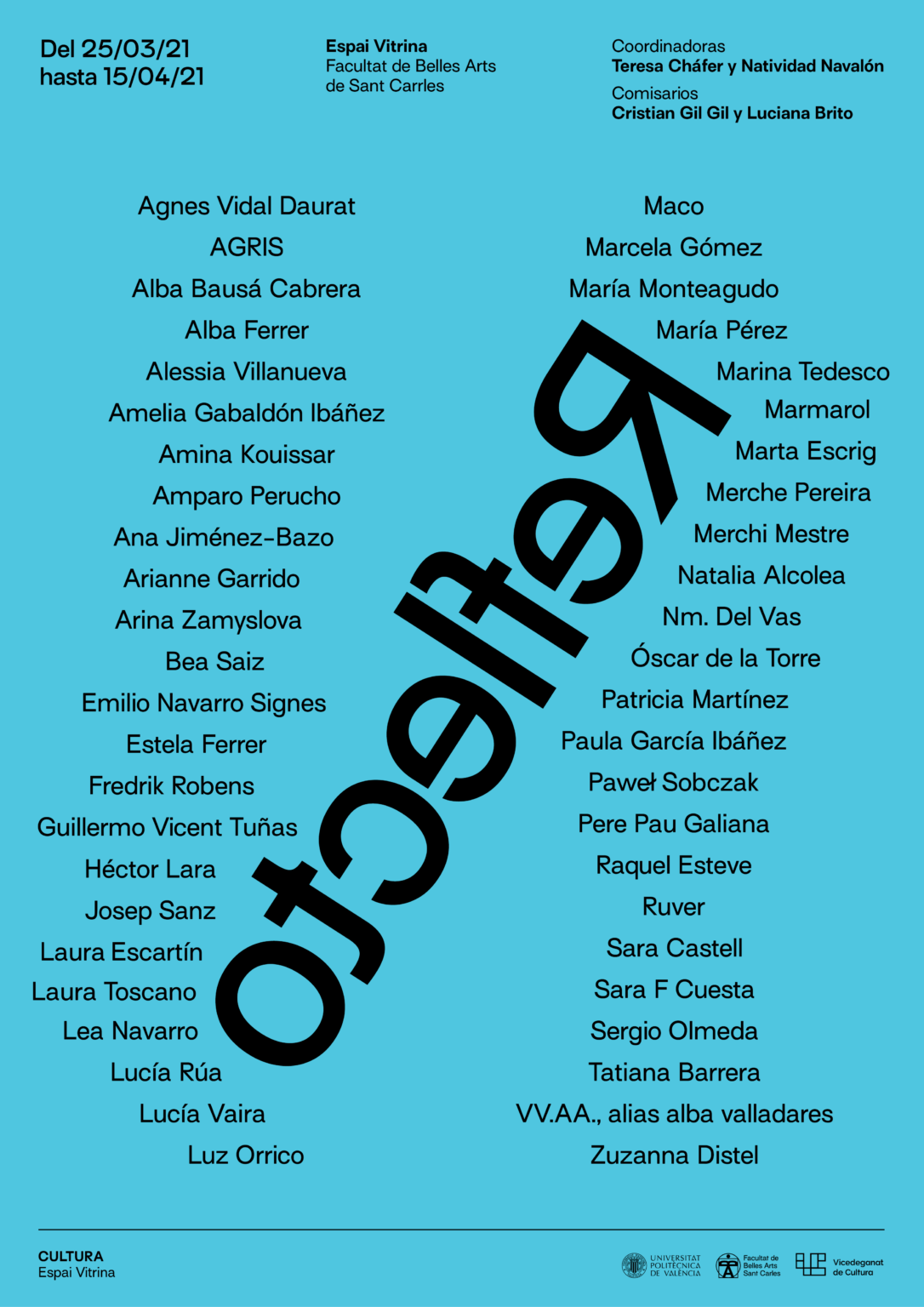 En la mostra participen: Agnes Vidal Daurat, AGRIS, Alba Bausá Cabrera, Alba Ferrer, Alessia Villanueva, Amelia Gabaldón Ibáñez, Amina Kouissar, Amparo Perucho, Ana Jiménez-Bazo, Arianne Garrido, Arina Zamyslova, Bea Saiz, Emilio Navarro Signes, Estela Ferrer, Fredrik Robens, Guillermo Vicent Tuñas, Héctor Lara, Josep Sanz, Laura Escartín, Laura Toscano, Lea Navarro, Lucía Rúa, Lucía Vaira, Luz Orrico, Maco, Marcela Gómez, María Monteagudo, María Pérez, Marina Tedesco, Marmarol, Marta Escrig, Merche Pereira, Merchi Mestre, Natalia Alcolea, Nm. Del Vas, Óscar de la Torre, Patricia Martínez, Paula García Ibáñez, Paweł Sobczak, Pere Pau Galiana, Raquel Esteve, Ruver, Sara Castell, Sara F Cuesta, Sergio Olmeda, Tatiana Barrera. VV.AA., alias Alba Valladares i Zuzanna Distel.
