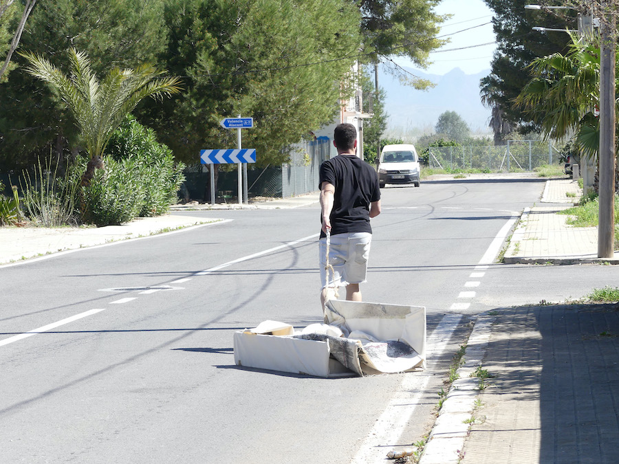 en el mismo momento en el que realiza un trayecto concreto. Dichas obras se materializan desde una acción performática: arrastrando las telas sobre la calle estableciendo un recorrido concreto dentro de un territorio. En el caso de la primera producción de la serie, el artista realizó un trayecto por diferentes barrios y distritos de la ciudad de València, documentando en un vídeo el recorrido y señalando desde una perspectiva crítica y de manera indirecta diferentes cuestiones que tienen que ver con el urbanismo y arquitectura en la ciudad y cómo estos aspectos condicionan la vida y la convivencia en las urbes contemporáneas.