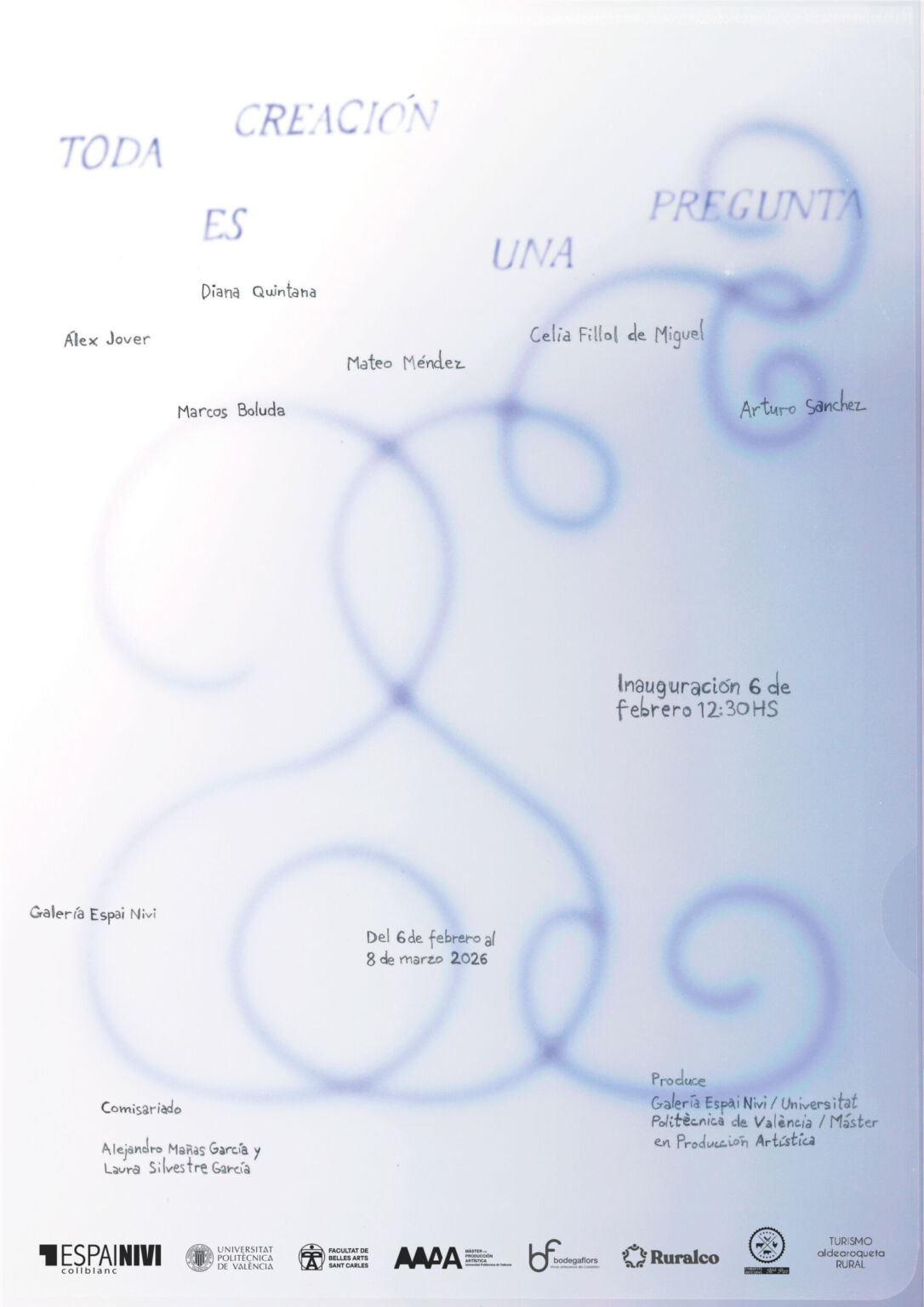 La Galería Espai Nivi acoge la exposición colectiva Toda creación es una pregunta, comisariada por Alejandro Mañas García y Laura Silvestre García (Universitat Politècnica de València), y protagonizada por Álex Jover, Diana Quintana, Marcos Boluda, Mateo Méndez, Arturo Sánchez y Celia Fillol de Miguel. La muestra se inaugura el 6 de febrero de 2026 a las 12:30 h y podrá visitarse hasta el 8 de marzo de 2026.